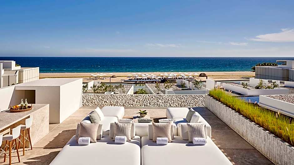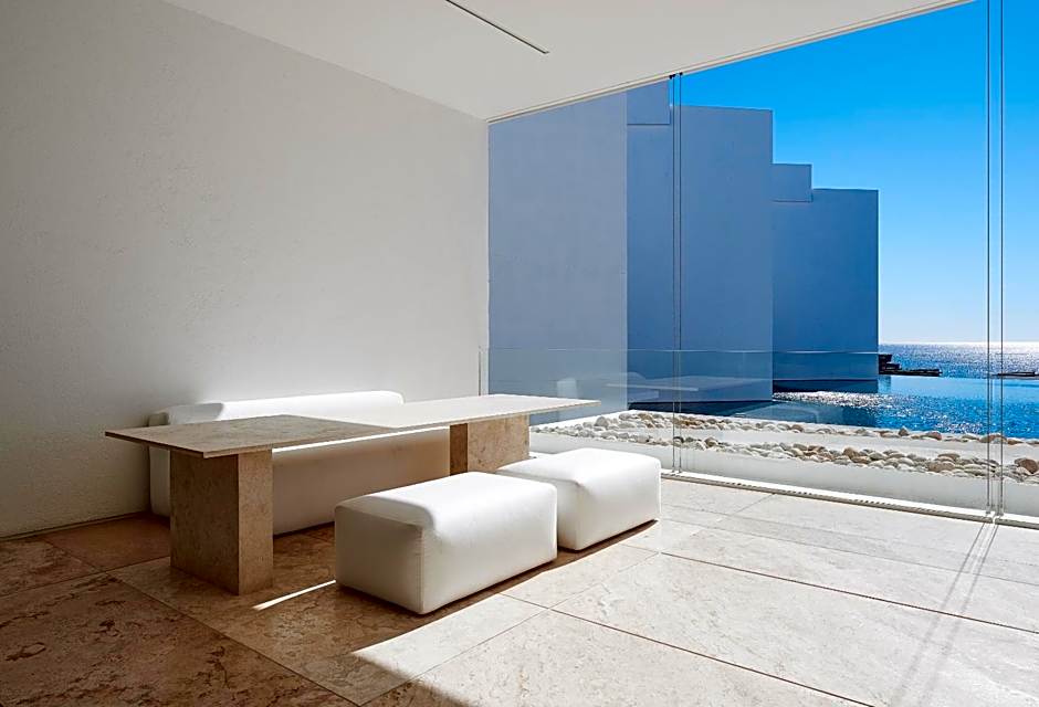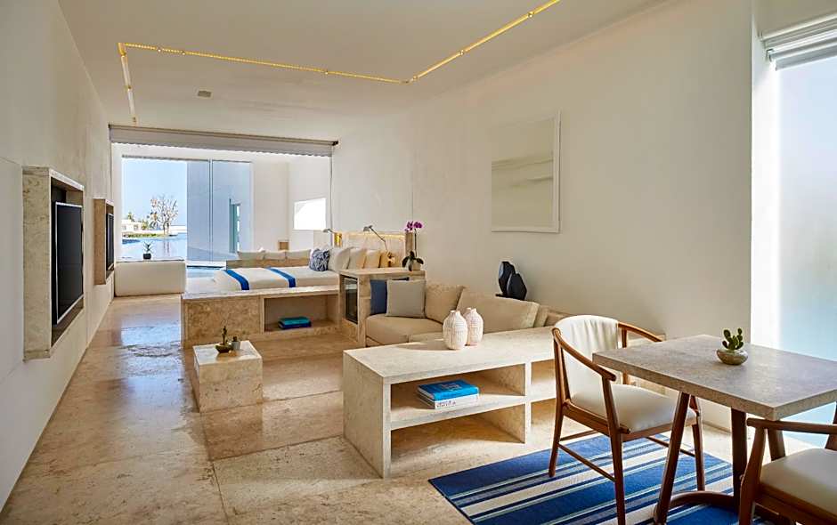 This suite combines open space with a bedroom and living and dining area that opens out onto the outdoor ocean view terrace with built-in seating, a breakfast table, a bath tub, and loungers. Other amenities include a work area, walk-in closet, two 65' flat-screen TV, mini bar and safe.